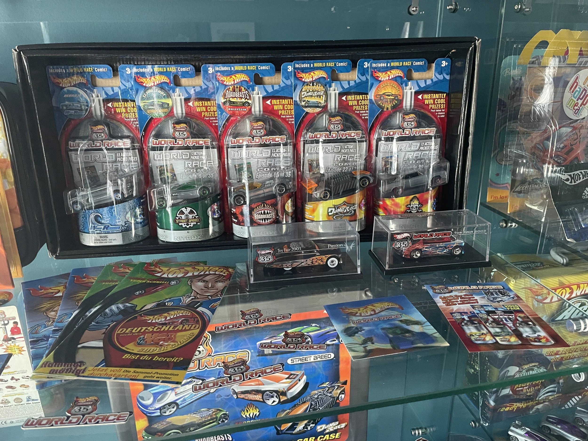 All 5 of the World Race McDonald’s Sets (still sealed), the Highway 35 Atomix car pack (in the back right corner) and even a full-size World Race Beach Towel!